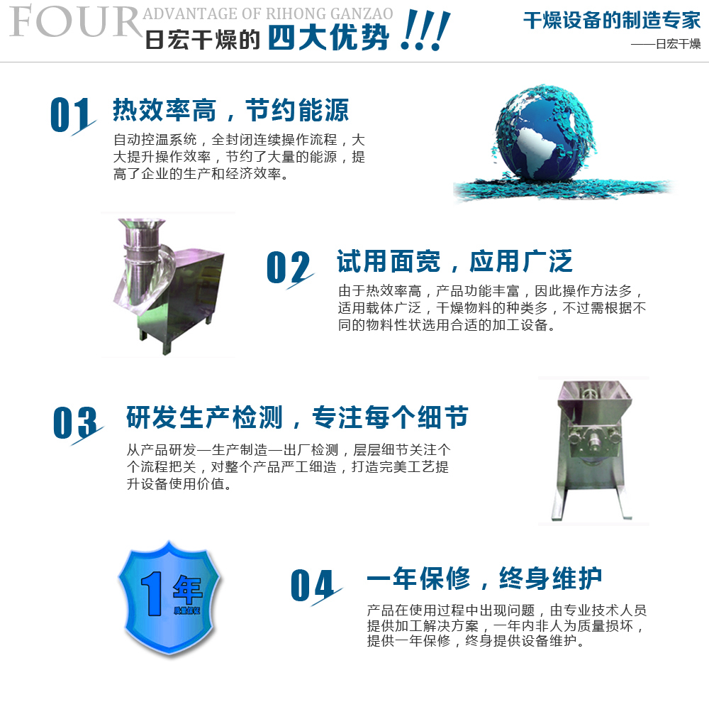 常州市日宏干燥有限公司可根據用戶的實際要求進行工程設計,目前單條生產線的產量有500kg/h、1000 kg/h .1500 kg/h。3000 kg/h等。雞精生產主要包括粉碎、秤重、混合、制粒、干燥、分篩、加香等步驟,我公司生產的具有工藝設計緊湊、設備制作精美、流水化運作程度高、產品品質穩定、易清潔保養等特點。設備與物料接觸部位全部采用優質不銹鋼材料,并經過精細拋光,耐鹽份腐蝕,清洗更方便,符合食品生產管理的QS要求及GMP標準。